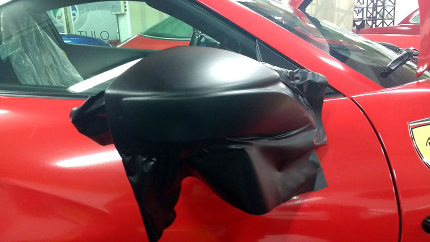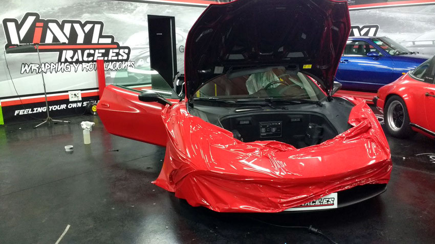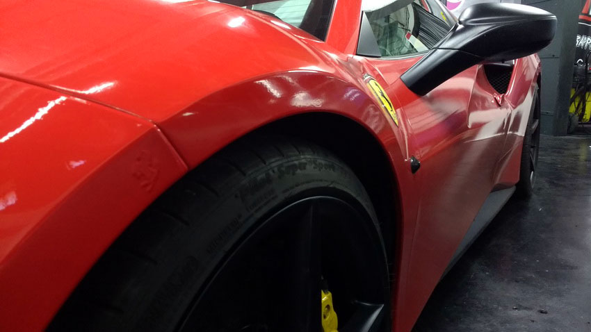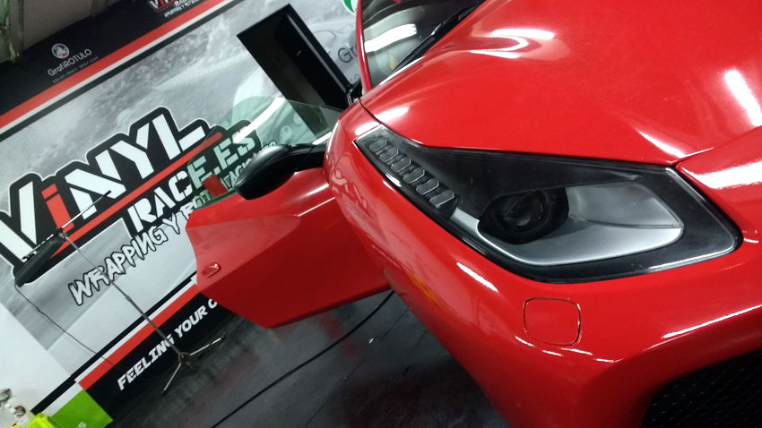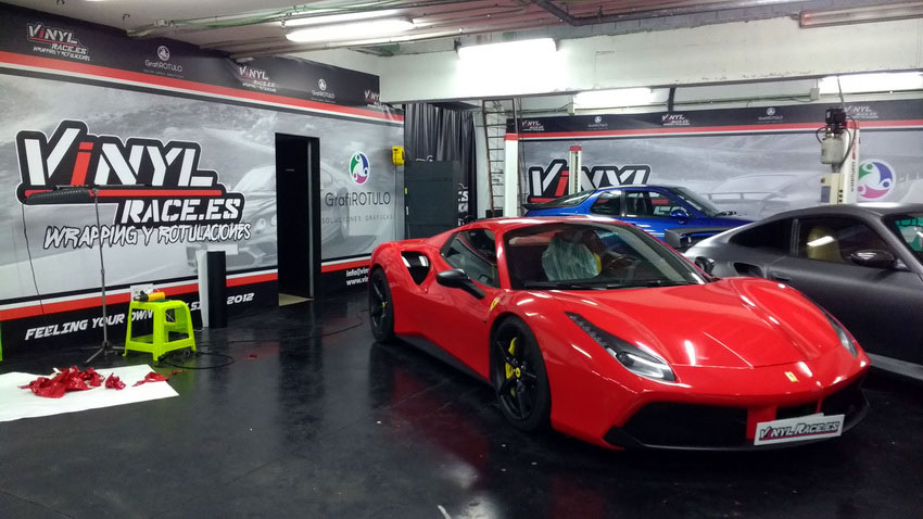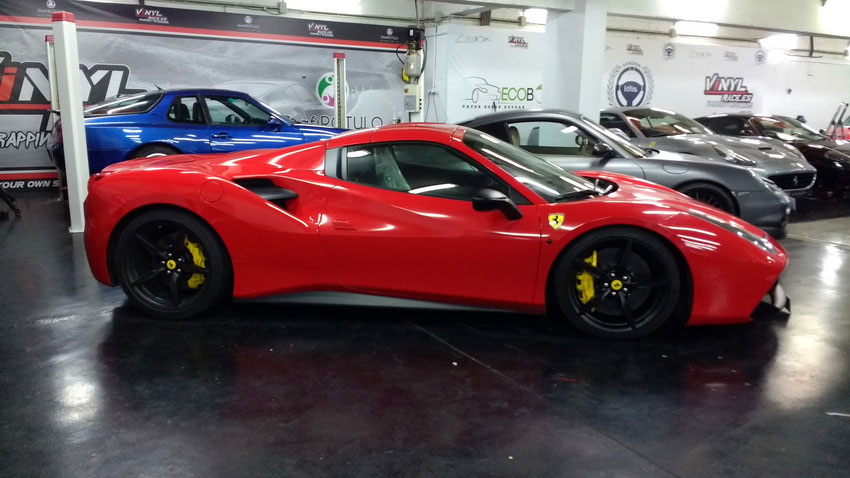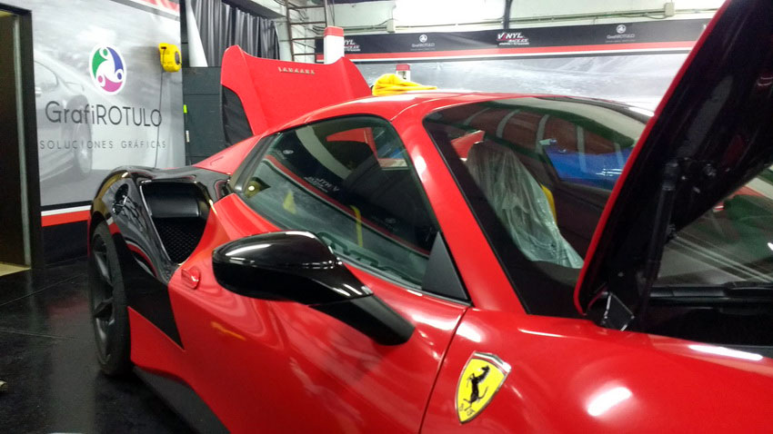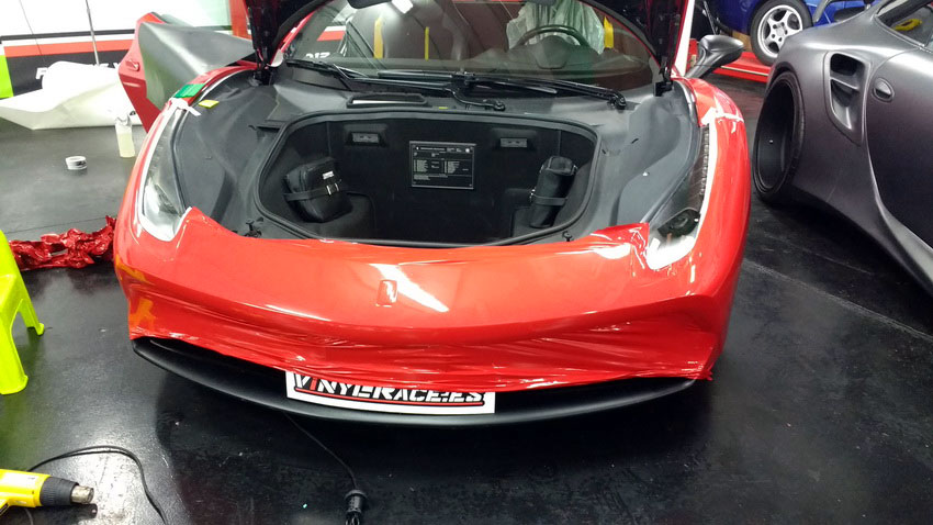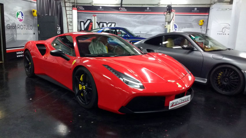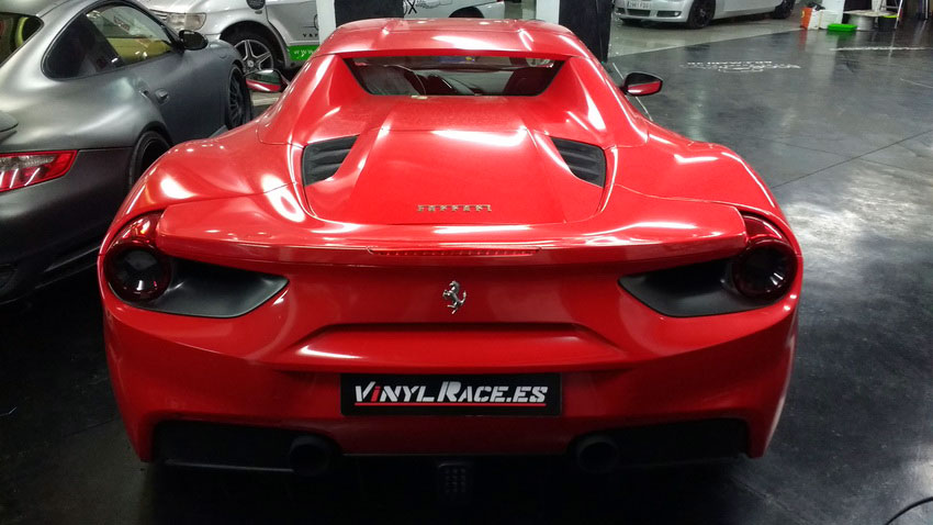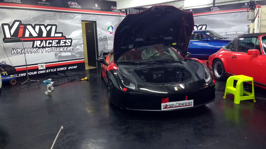 Una Ferrari como este 488 siempre queda mejor en rojo vivo, sin problema cubrimos el negro de origen y si el dueño desea volver al color de fábrica siempre podrá retirar el vinilo y comprobar el perfecto estado de la pintura.