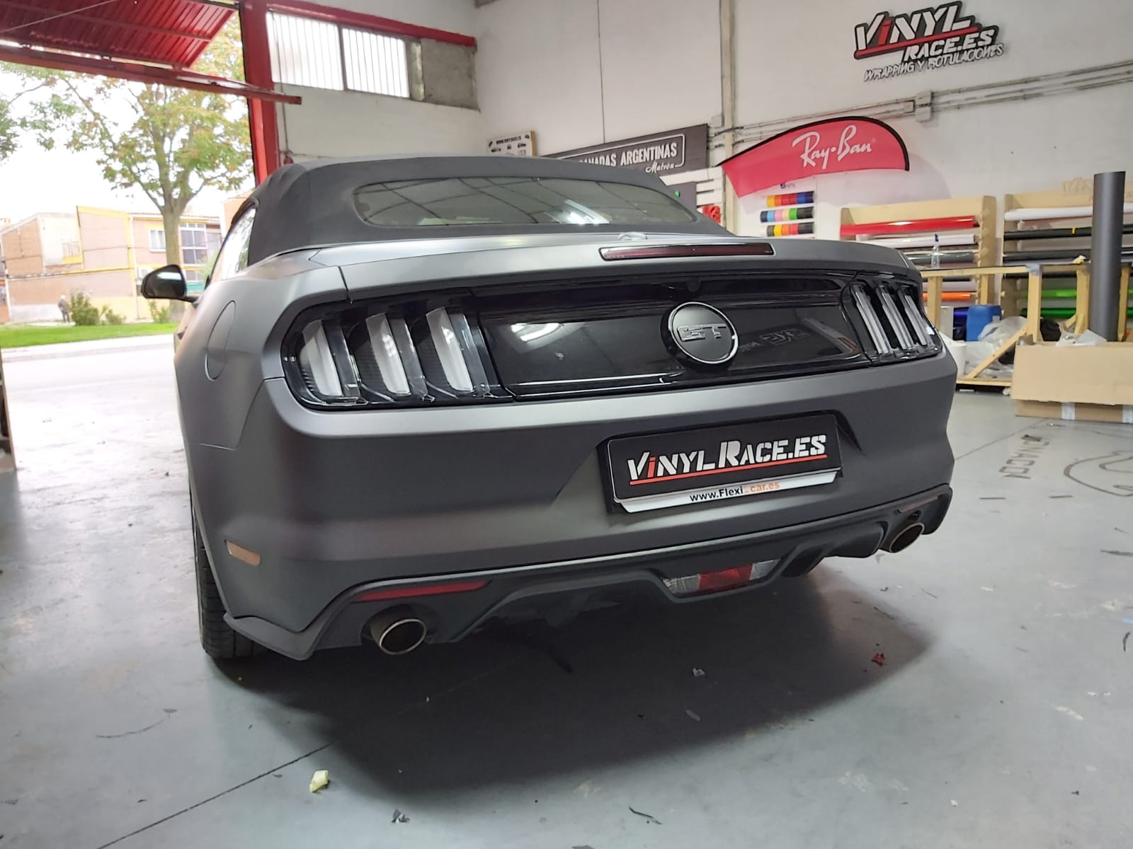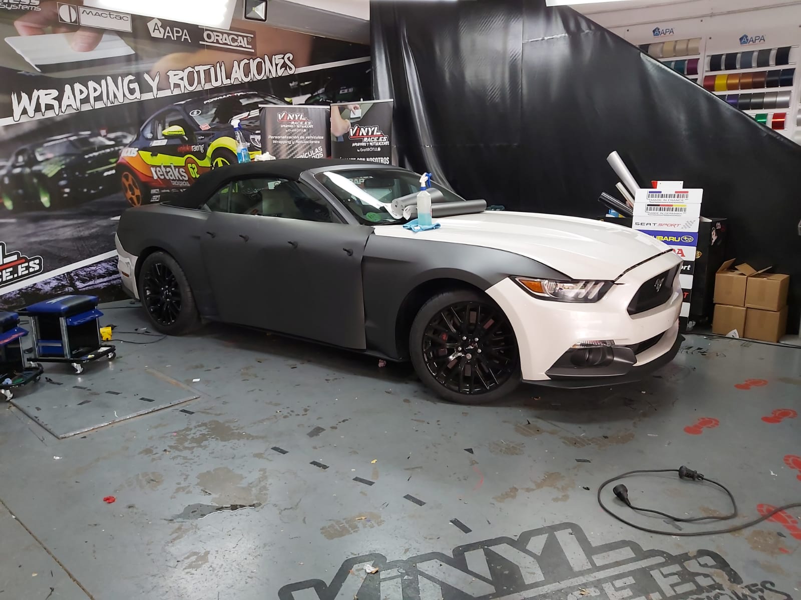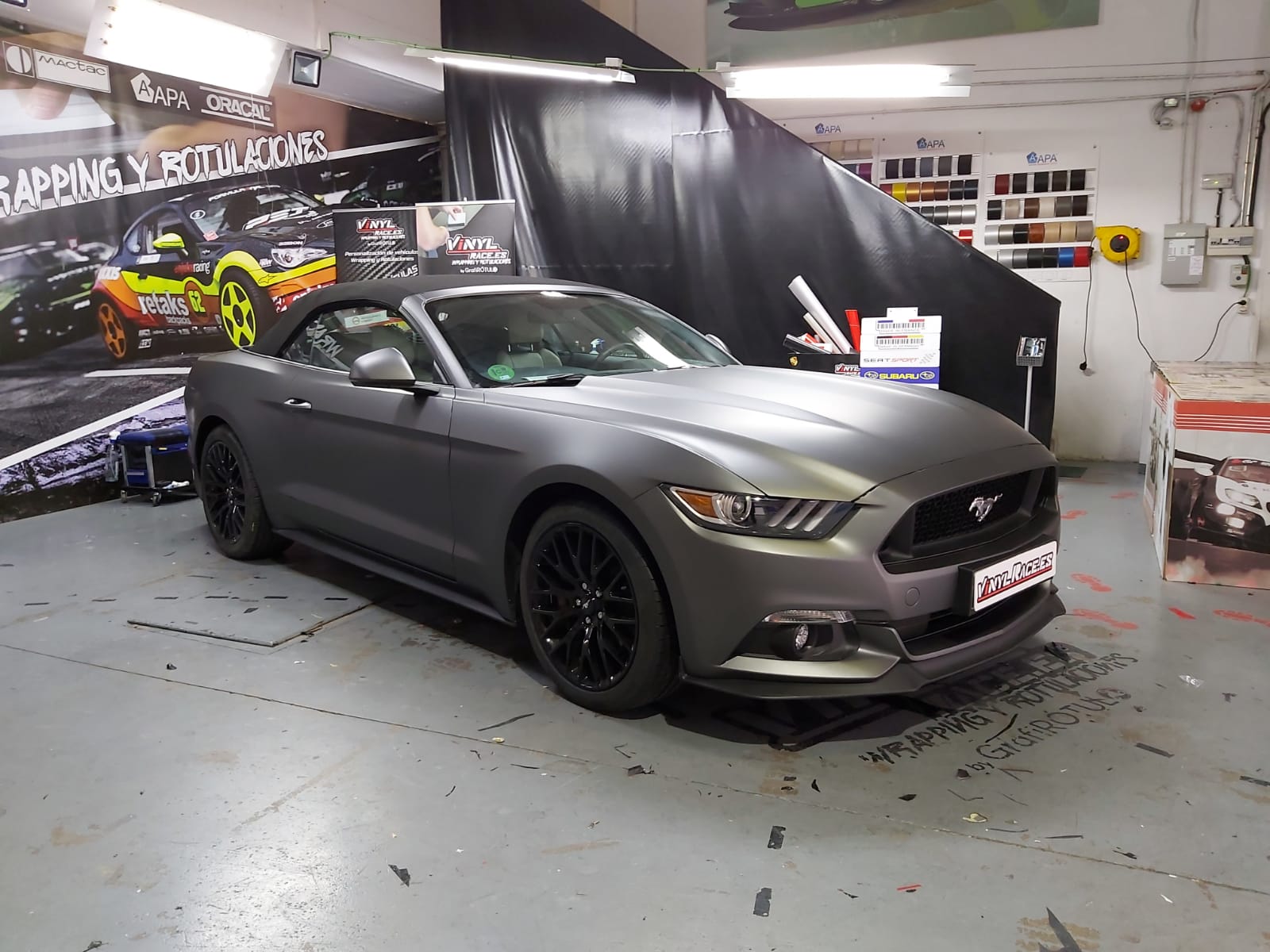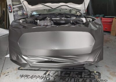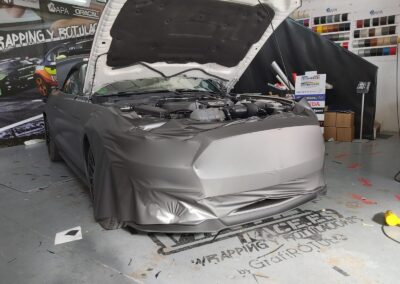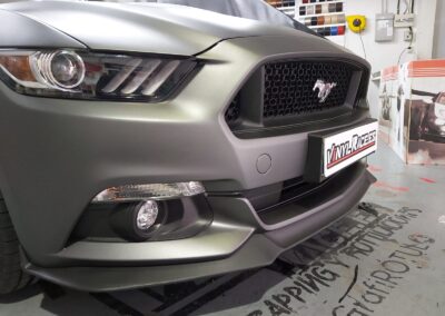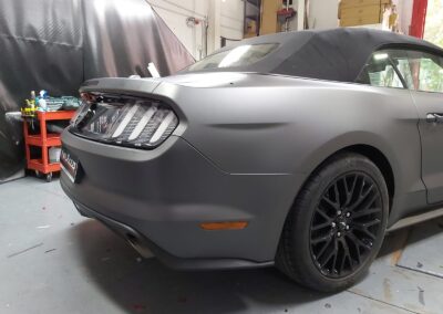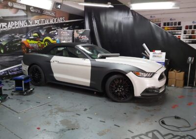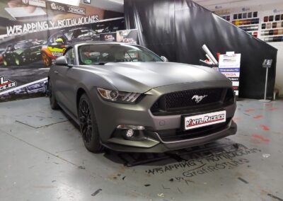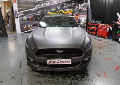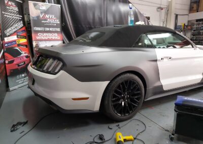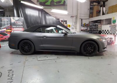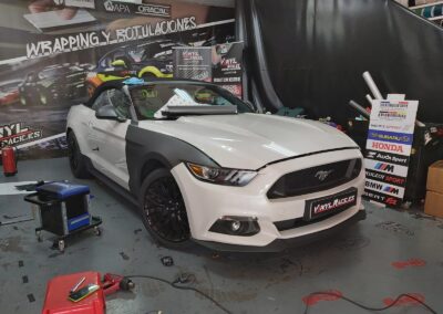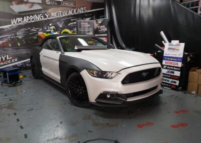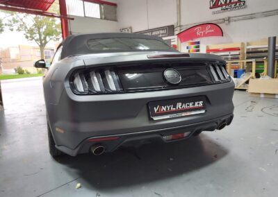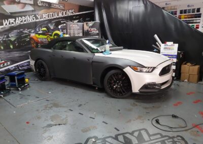 Recibimos este magnifico Ford Mustang cabrio, cuyo blanco original no resalta sus virtudes, por eso aplicamos unos metros de vinilo 3M M261 Matte Dark Grey, cambia por completo la personalidad del Mustang.