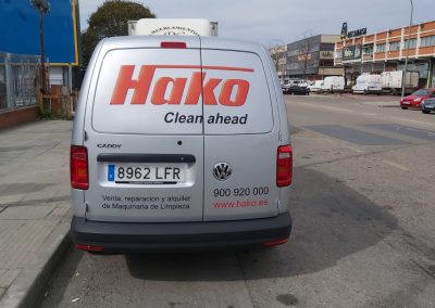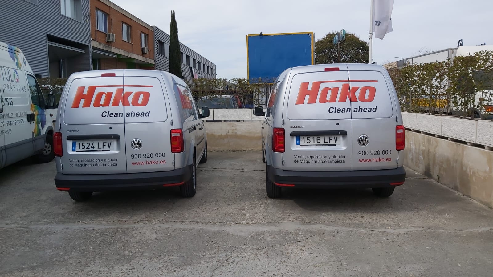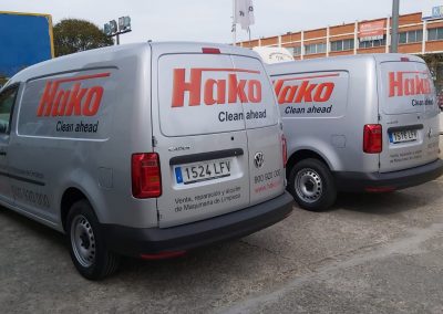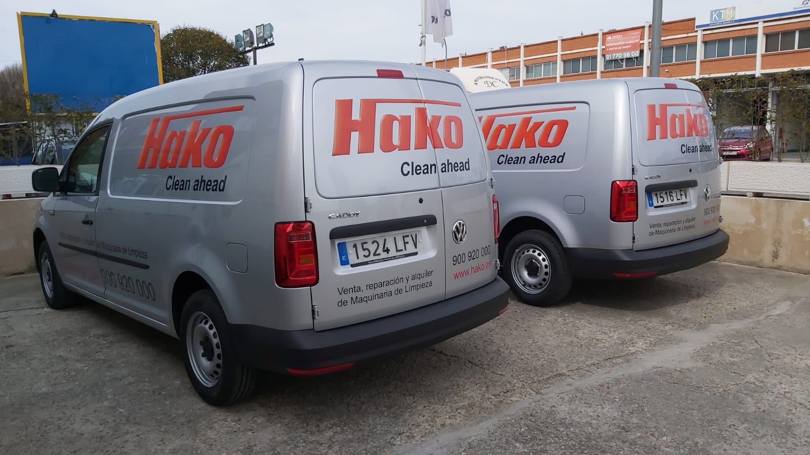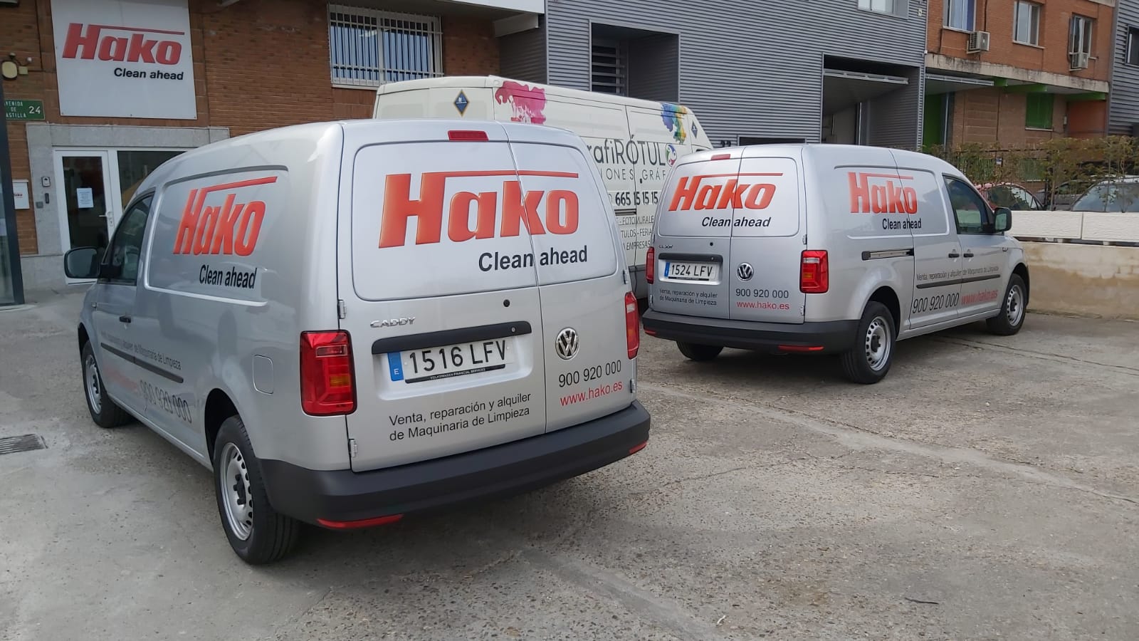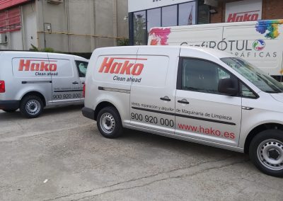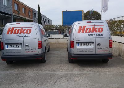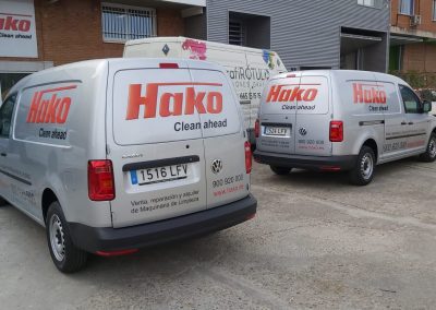 Rotulación de estas Volkswagen Caddy del fabricante internacional líder en equipos de limpieza industrial «Hako» con vinilos en impresión digital troquelado.