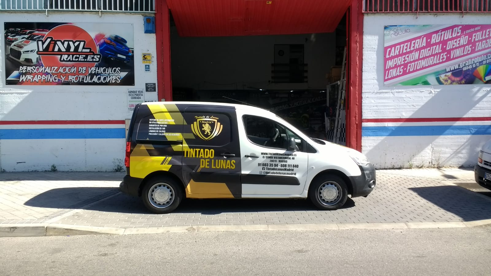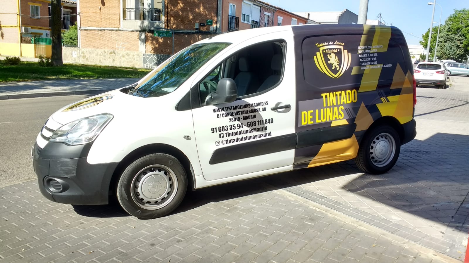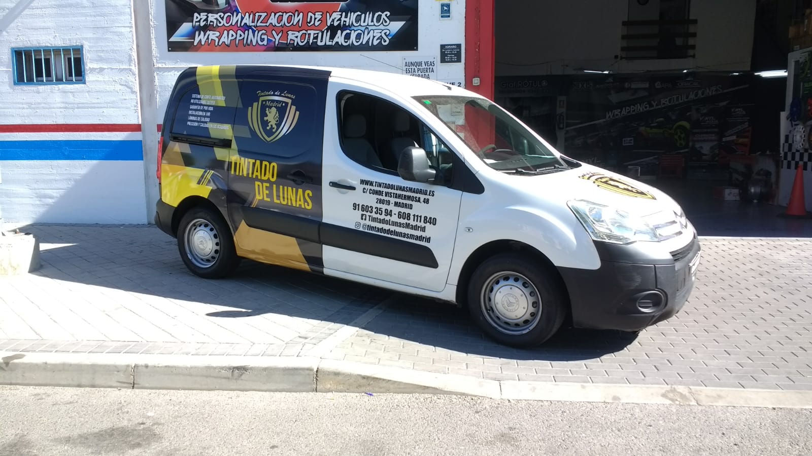 Envolvemos la mitad de esta furgoneta Citröen con vinilo impreso, diseño personalizado con la imagen corporativa de Tintado De Lunas Madrid, vinilo de corte en puertas y termina con logotipo en vinilo impreso en el capó.