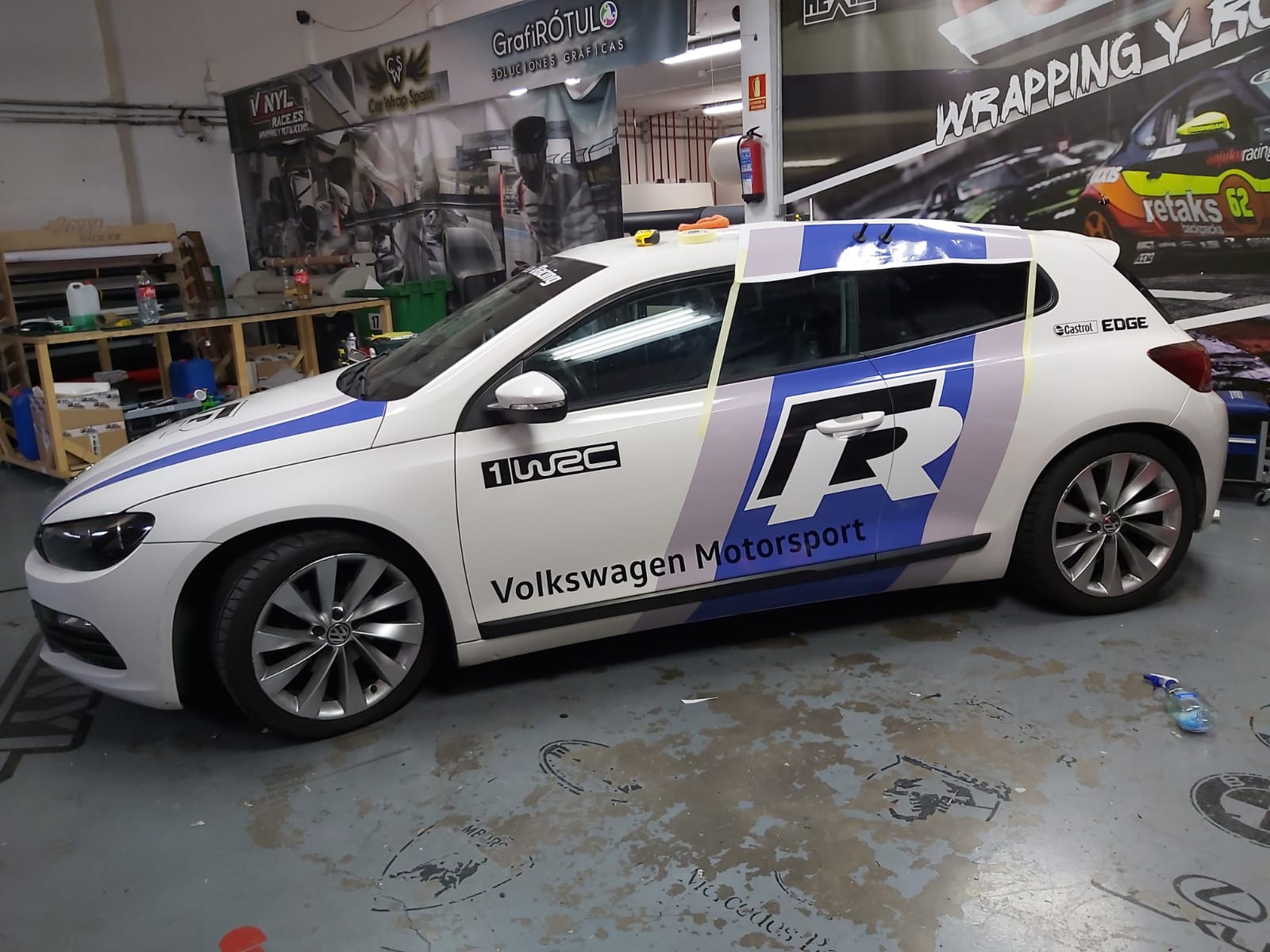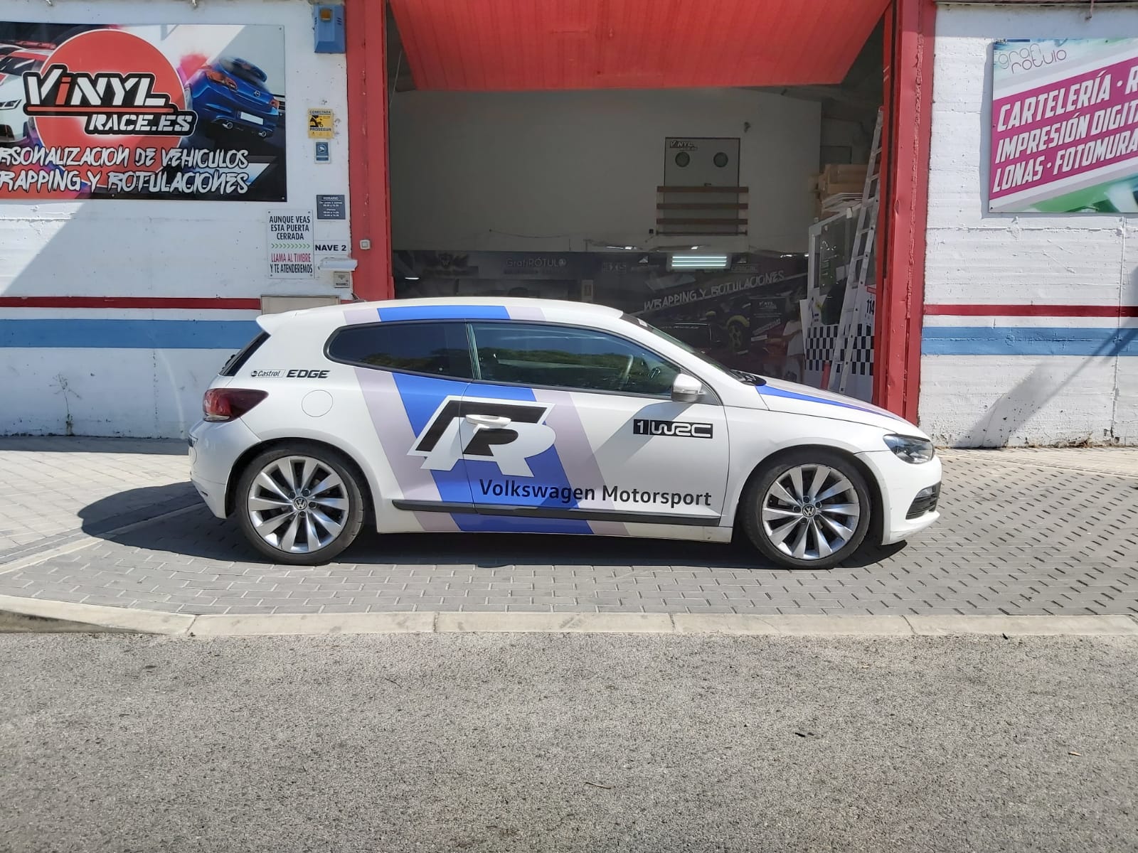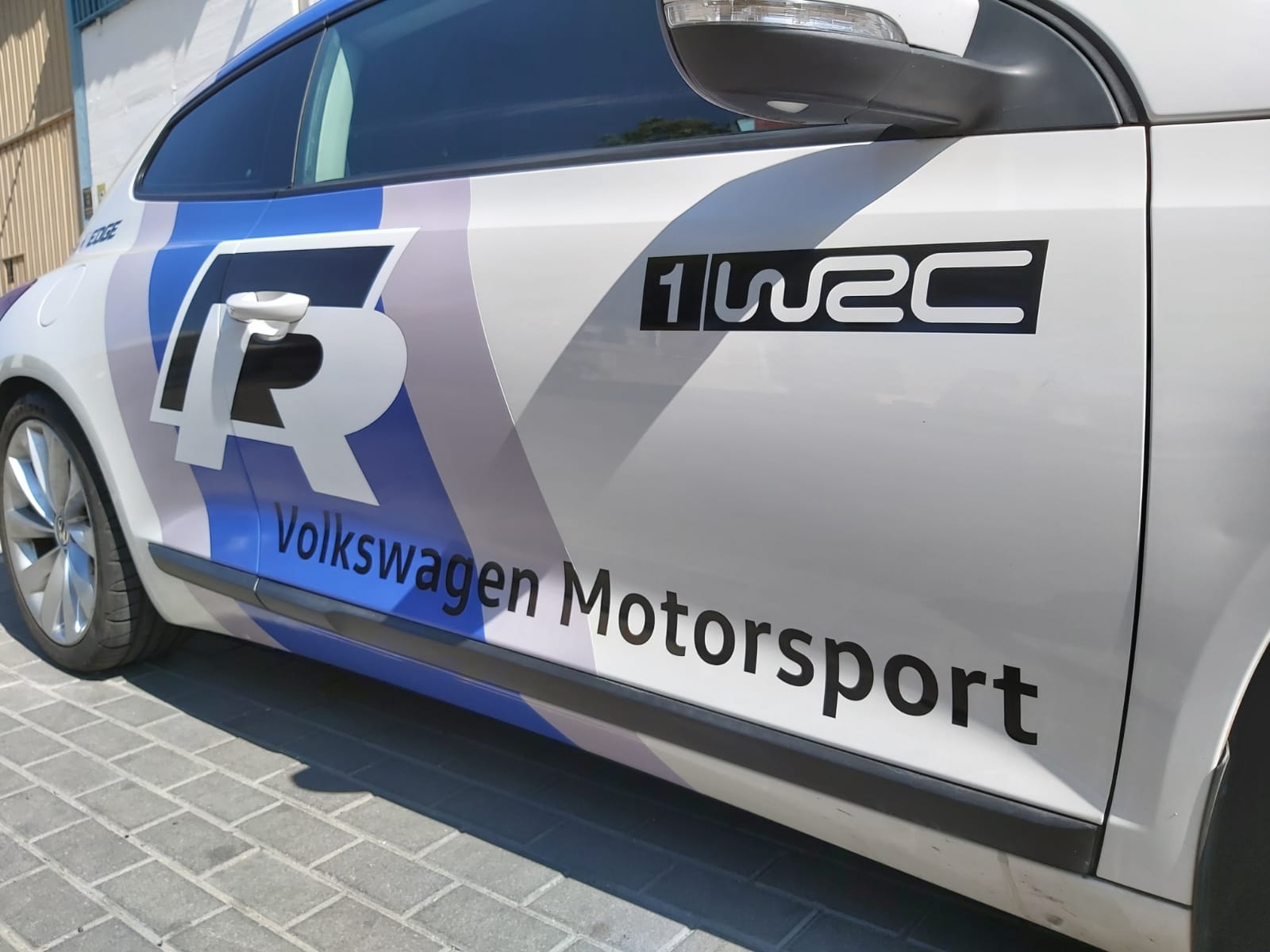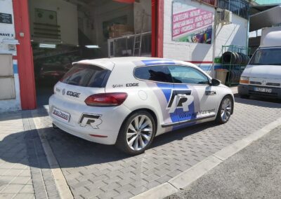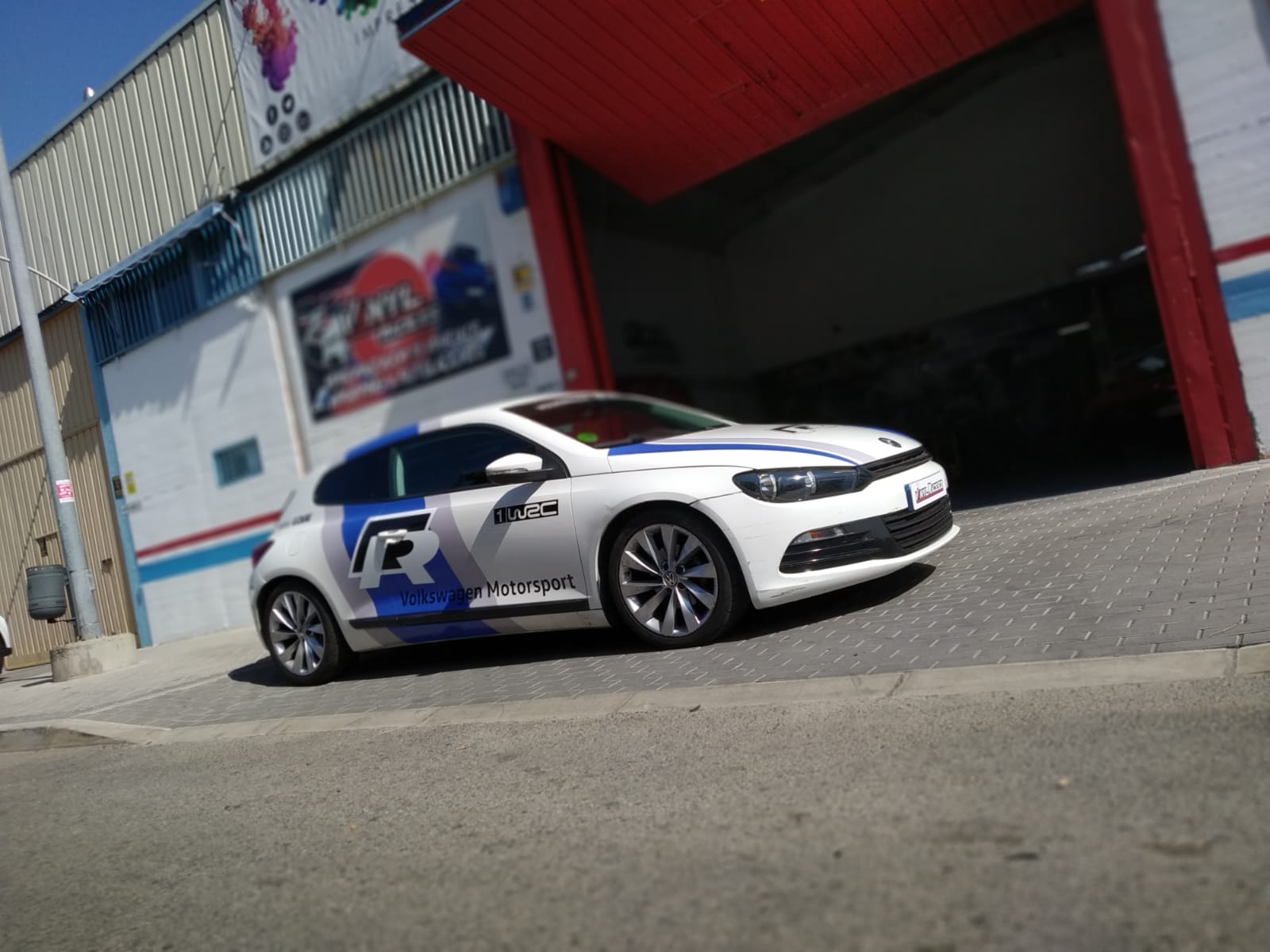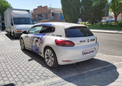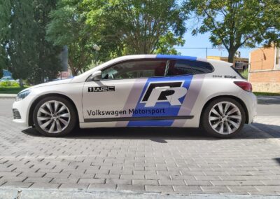 Una rotulación réplica basada en los colores del Wolskwagen Polo WRC, aplicada en el Scirocco R, se ve todavía más espectacular.